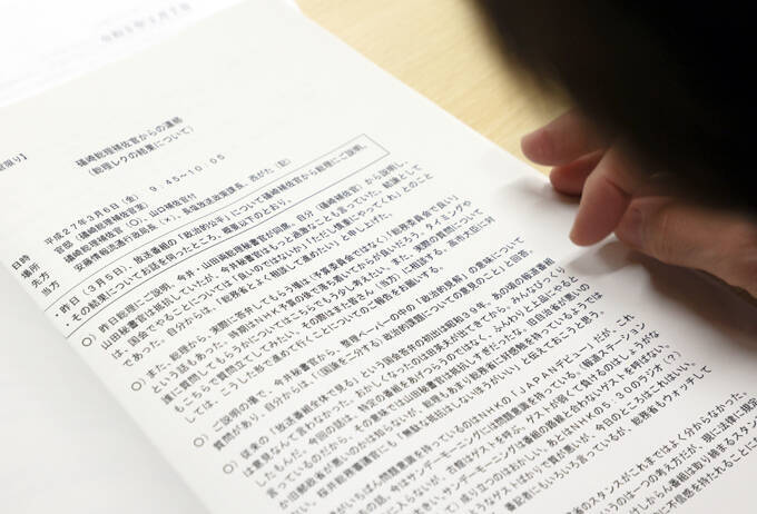 立憲民主党の小西洋之参院議員が安倍政権当時の総務省作成として公表した、放送法の「政治的公平」に関する内部文書=2023年3月3日午後 写真提供:共同通信社