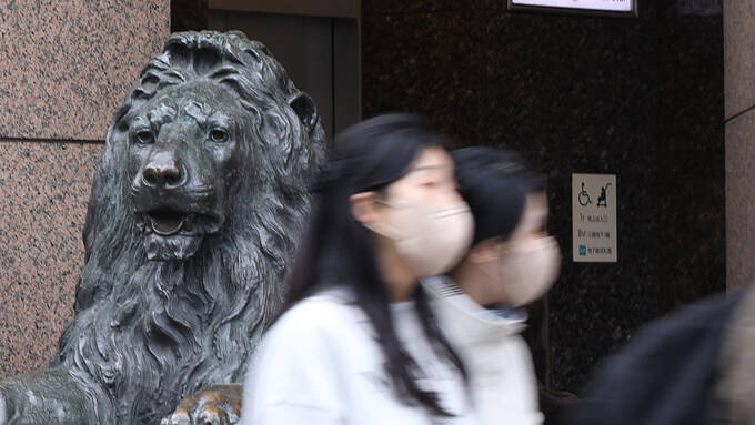 商業施設「銀座三越」の、2023年3月13日のマスク着用ルール緩和後にマスクを外したライオン像=東京都中央区 写真提供:時事通信社