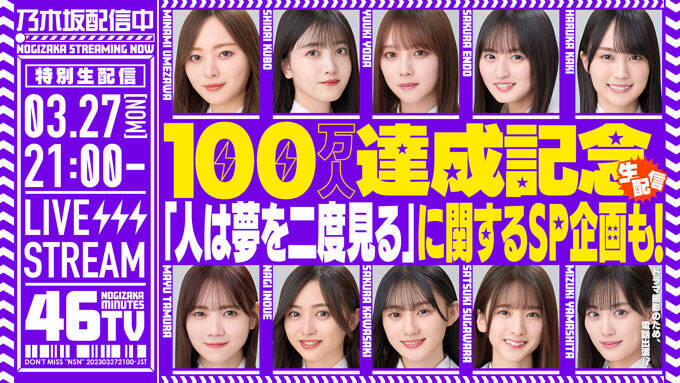 乃木坂46公式YouTubeチャンネル「乃木坂配信中」にて、チャンネル登録者数の100万人達成と、3/29(水)に発売する乃木坂46 32ndシングル「人は夢を二度見る」のリリースを記念して、3/27(月)21時より「乃木坂46分TV」と題した生配信を行うことが決定した。