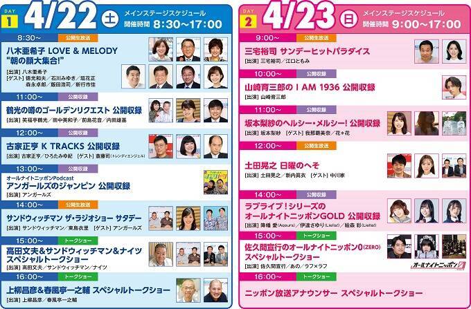 メインステージでは、4月22日(土)は「八木亜希子 LOVE&MELODY」、「サンドウィッチマン ザ・ラジオショー サタデー」の公開生放送、「鶴光の噂のゴールデンリクエスト」「古家正亨 K TRACKS」「オールナイトニッポンPODCAST アンガールズのジャンピン」の公開収録、高田文夫&サンドウィッチマン&ナイツ、上柳昌彦&春風亭一之輔のトークショーが開催。4月23日(日)は「三宅裕司 サンデーヒットパラダイス」「土田晃之 日曜のへそ」の公開生放送、「山崎育三郎の I AM 1936」「坂本梨紗のヘルシー・メルシー!」「ラブライブ!シリーズのオールナイトニッポンGOLD」の公開収録、「佐久間宣行のオールナイトニッポン0(ZERO)」、ニッポン放送アナウンサーのスペシャルトークショーが開催される。