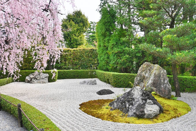 置かれている石や岩は、仏教で世界の中心にそびえる山「須弥山」や、仏様を表していると言われます。「枯山水」の代表的な庭園に、京都「龍安寺」の庭園などがあります。