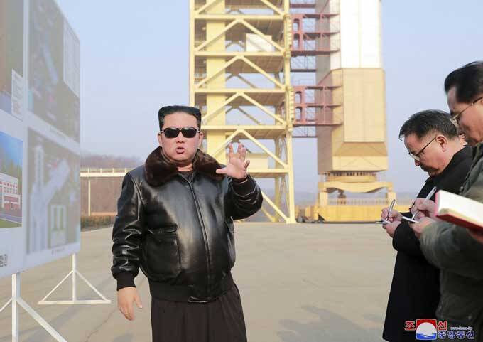 (2022年3月配信画像)北朝鮮・東倉里の「西海衛星発射場」を現地指導する金正恩朝鮮労働党総書記(朝鮮中央通信=共同)