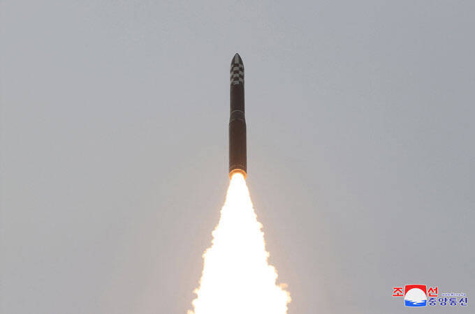 2023年4月13日に行われた新型大陸間弾道ミサイル(ICBM)「火星砲18」型の試射(朝鮮中央通信=朝鮮通信)=クレジット:朝鮮通信/共同通信イメージズ