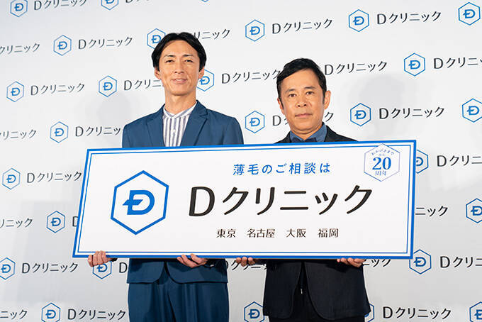 ナインティナインの岡村隆史と矢部浩之が8月29日(木)、東京・六本木の東京ミッドタウンで行われた、頭髪治療専門クリニック「Dクリニック」の新CM発表会に出席。よゐこ・濱口優も司会進行役として出席し、CM撮影の裏側や薄毛のリアルな悩みを語った。