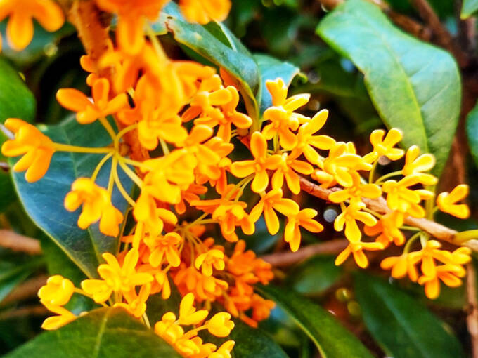 キンモクセイは常緑樹で1年中青々としていますが、秋分の時期から突然、小さな橙色の花を一斉に咲かせ、華やかな香りを放ちます。この橙色を金色に見立てて「キンモクセイ」という名前が付いたと言われています。