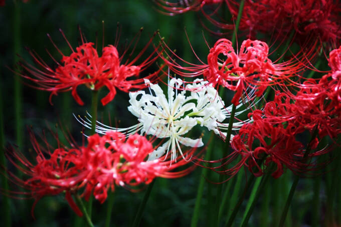「彼岸花」は中国が原産で、一般的には鮮やかな紅い色をしています。「彼岸花」という名前は、秋の彼岸のころに咲くところから付いたとされています。