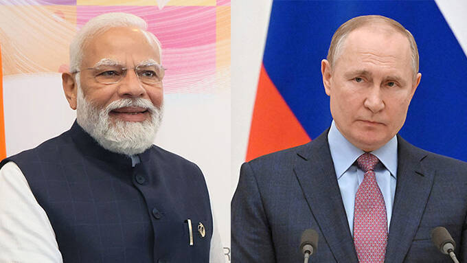 (左)2023年5月20日、日印首脳会談~出典:首相官邸HPより/(右)モスクワのクレムリンで、ベラルーシ大統領との共同記者会見に臨むロシアのプーチン大統領(ロシア・モスクワ) AFP=時事 写真提供:時事通信