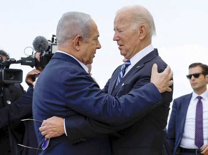 イスラエル中部テルアビブの空港に到着し、同国のネタニヤフ首相(左)に出迎えられるバイデン米大統領=2023年10月18日(ロイター=共同)