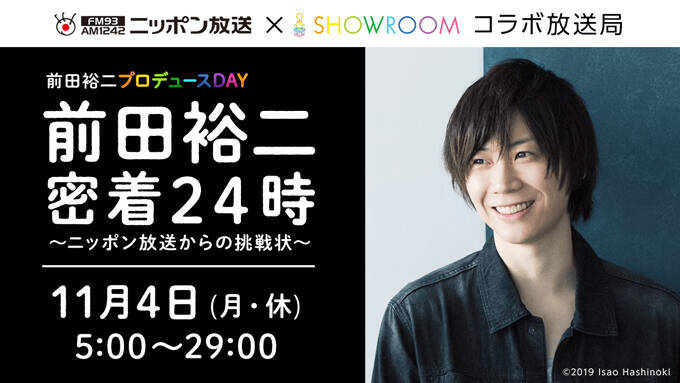 SHOWROOM株式会社(本社:東京都渋谷区、代表取締役社長:前田裕二)が運営する仮想ライブ空間「SHOWROOM」にて、11月4日(月・休)に「ニッポン放送×SHOWROOM コラボ放送局~前田裕二プロデュースDAY」の一環として前田裕二が“24時間で本作り”に挑戦する。