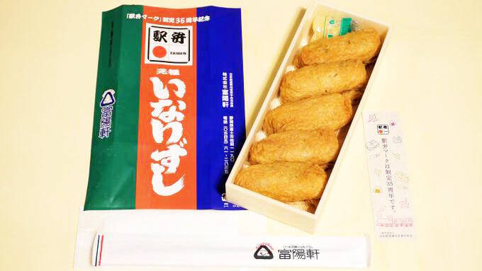 東海道新幹線で富士山がよく見える駅といえば新富士駅。よく見えるのは、東京方面の上り1番線ホームです。このホームには、新富士の駅弁を製造・販売している富陽軒の売店(営業時間9:00~13:30、水・日休み)があります。全国29社で行われている「駅弁マーク制定35周年」の記念駅弁企画、富陽軒は100年あまり前の創業時から作り続けられている「いなりずし」(460円)で参加しています。コロナ禍でしばらくお休みしていた分、久しぶりの「復活」が嬉しいですね!