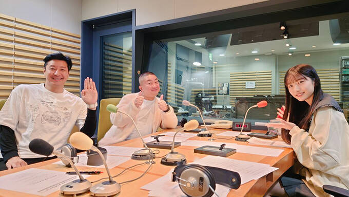 「坂道の向こうには青空が広がっていた。」でMCを担当するチョコレートプラネットの長田(左)と松尾(中央)、僕が見たかった青空の早﨑すずき(右)