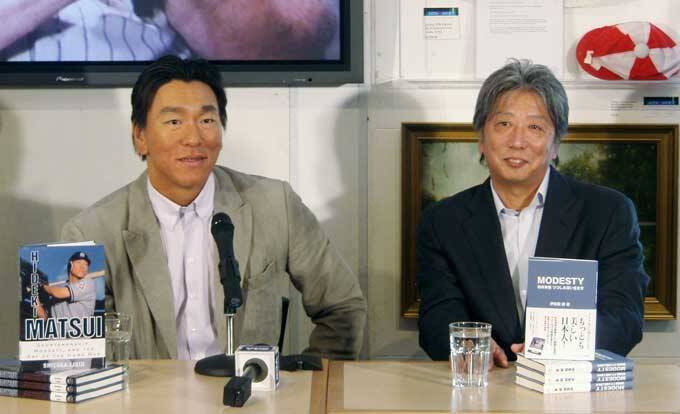 米大リーグ、ヤンキースの松井秀喜外野手を描いた本「MODESTY」を出版し、松井本人と会見する作家の伊集院静氏(右)(アメリカ・ニューヨーク) 撮影日:2007年04月06日 写真提供:時事通信社