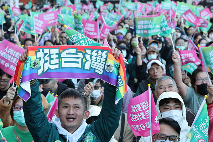 民主進歩党本部の近くに集まり、台湾総統選の開票の行方を見守る同党の支持者ら=2024年1月13日午後、台北(松本健吾撮影) 写真提供:産経新聞社