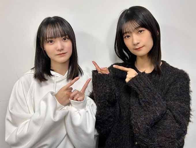 自身が執筆したコント台本のこだわりを明かす櫻坂46 増本綺良(左)と番組メインパーソナリティの井上梨名(右)