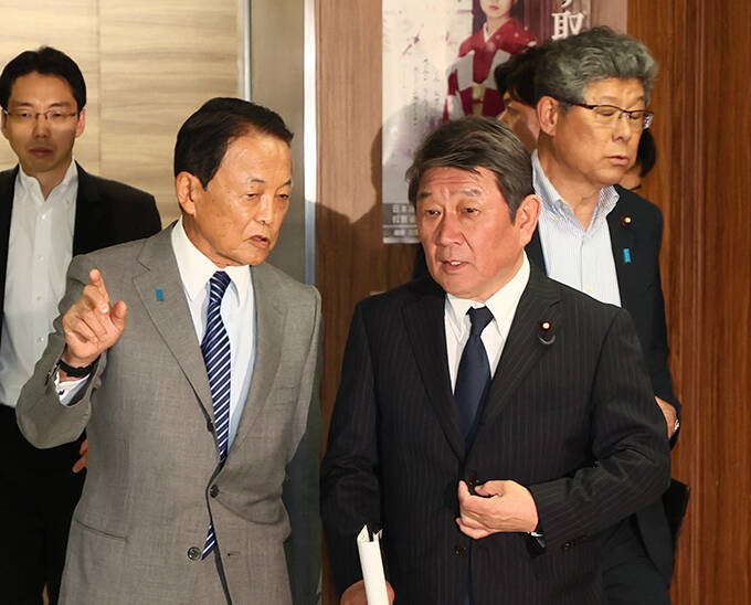 自民党役員会に臨む(左から)麻生太郎副総裁、茂木敏充幹事長、高木毅国対委員長=2023年6月12日午後、東京・永田町の党本部 写真提供:産経新聞社