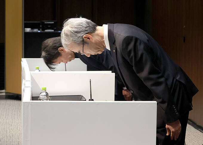 【豊田自動織機会見】会見冒頭で頭を下げる伊藤浩一社長(手前)と経営役員の原茎太郎氏=2024年1月29日午後、東京都千代田区(酒井真大撮影) 写真提供:産経新聞社