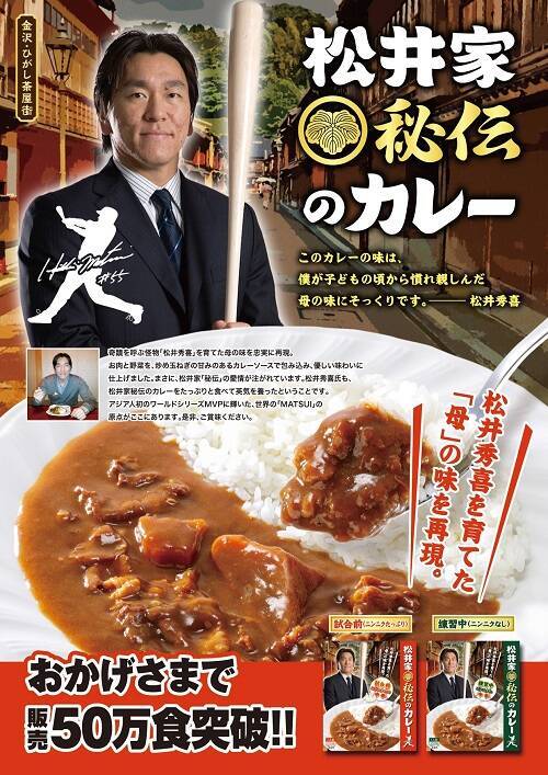 松井秀喜のパワーの源となった、母さえ子さんの手作りカレーを忠実に再現し、レトルトパックとして2013年から発売されている「松井家秘伝のカレー」。ついに累計販売数が50万食を突破、好調なセールスが続いている。