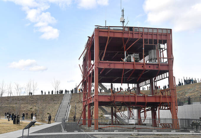 東日本大震災から13年となった11日、南三陸町の防災対策庁舎には朝から花を手向けたり手を合わせる人の姿が見られた。14時46分にサイレンがなると、訪れた人たちは黙とうした=2024年3月11日午後、宮城県南三陸町(三尾郁恵撮影) 写真提供:産経新聞社