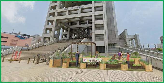 フジテレビでは、お台場の本社屋に農園『アクションお台場ファーム』を設置し、登録した利用者みんなで野菜を育てる。種まきからお手入れ、収穫まで楽しくシェアでき、参加するだけで食や環境の課題に貢献できる仕組みになっている。