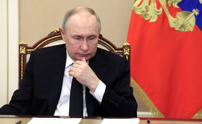 25.03.2024 Russian President Vladimir Putin chairs a video conference meeting discussing post-terrorist attack measures at the Crocus City Hall concert venue at the Novo-Ogaryovo state residence, outside Moscow, Russia. Mikhail Metzel / POOL Sputnik/共同通信イメージズ