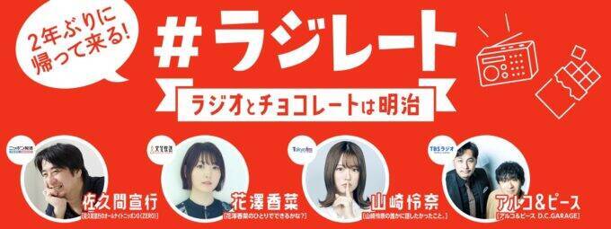 2月10日(月)19時から『第3回ラジレート ~ラジオとチョコレートは明治~』が開催される。ラジレートは、2022年9月、2023年2月と、過去2回開催された生配信特別番組。