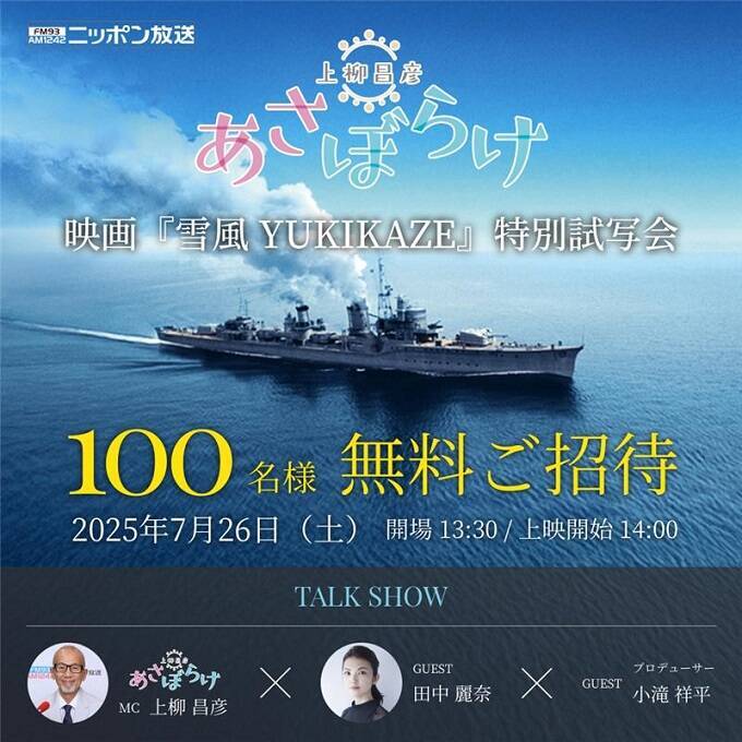 上柳昌彦がパーソナリティを務めるニッポン放送『上柳昌彦 あさぼらけ』(毎週月曜5時-6時、火-金曜4時半-6時)では、番組リスナーを招待しての映画『雪風 YUKIKAZE』(配給:ソニー・ピクチャーズ エンタテインメント/バンダイナムコフィルムワークス)特別試写会の実施が決定した。8月15日(金)の公開に先立ち、7月26日(土)にニッポン放送イマジンスタジオで開催される。