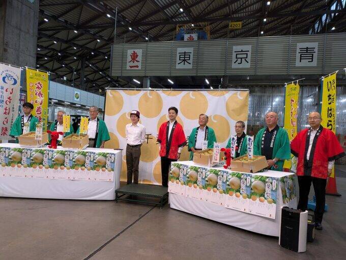 2日、東京・大田市場で千葉県産梨の季節到来を知らせる「千葉なし出陣式」が初めて行われ、主要産地の生産者代表と熊谷俊人千葉県知事が出席し、市場関係者などにPRした。