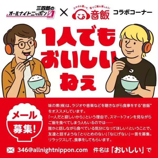 毎週、三四郎が最も「おいしくなった」と感じたメールを読まれた方には、三四郎×音飯コラボステッカーと、味の素(株)商品詰め合わせをプレゼントする。メールの件名に「おいしい」と書いて 346@allnightnippon.comまで。