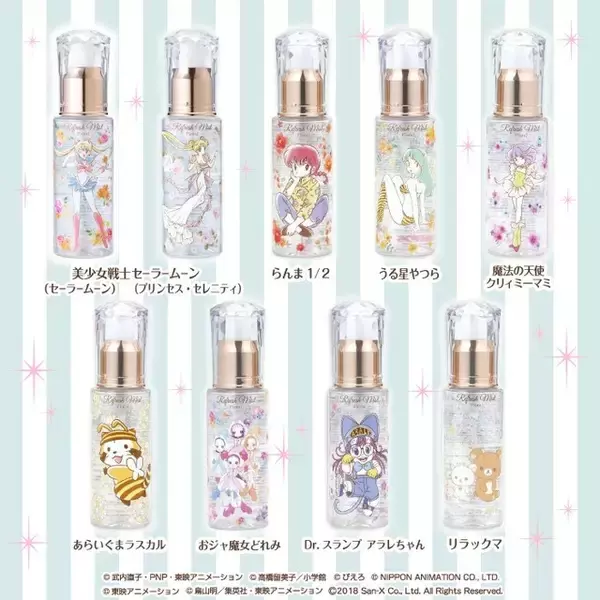 オトナ女子に向けた本アイテムは、『美少女戦士セーラームーン』『らんま1/2』『うる星やつら』『魔法の天使 クリィミーマミ』『あらいぐまラスカル』『おジャ魔女どれみ』『クレヨンしんちゃん』『Dr.スランプ アラレちゃん』の全8種類がラインナップ。さらに「リフレッシュミスト」には「リラックマ」が加わった9種類で発売される。