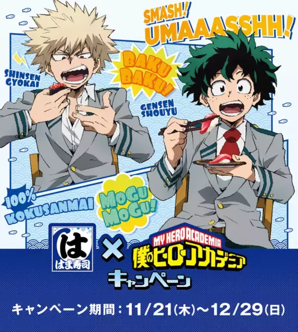 「はま寿司」×TVアニメ『僕のヒーローアカデミア』キャンペーン キービジュアル (C)堀越耕平/集英社・僕のヒーローアカデミア製作委員会(C)2019「僕のヒーローアカデミア THE MOVIE」製作委員会 (C)堀越耕平/集英社