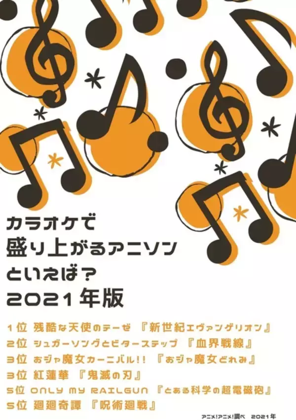 「カラオケで盛り上がるアニソンといえば?3位「おジャ魔女」おジャ魔女カーニバル!!、2位「血界戦線」シュガーソングとビターステップ、1位「新世紀エヴァンゲリオン」残酷な天使のテーゼ<21年版>」の画像