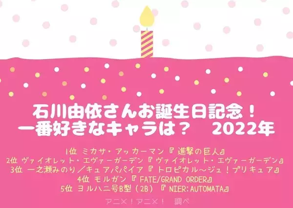 「石川由依さんお誕生日記念!一番好きなキャラは? 3位「トロプリ」キュアパパイア、2位ヴァイオレット・エヴァーガーデン、1位「進撃の巨人」ミカサ<22年版>」の画像1 「石川由依さんお誕生日記念!一番好きなキャラは? 3位「トロプリ」キュアパパイア、2位ヴァイオレット・エヴァーガーデン、1位「進撃の巨人」ミカサ<22年版>」の画像2 「石川由依さんお誕生日記念!一番好きなキャラは? 3位「トロプリ」キュアパパイア、2位ヴァイオレット・エヴァーガーデン、1位「進撃の巨人」ミカサ<22年版>」の画像3 「石川由依さんお誕生日記念!一番好きなキャラは? 3位「トロプリ」キュアパパイア、2位ヴァイオレット・エヴァーガーデン、1位「進撃の巨人」ミカサ<22年版>」の画像4