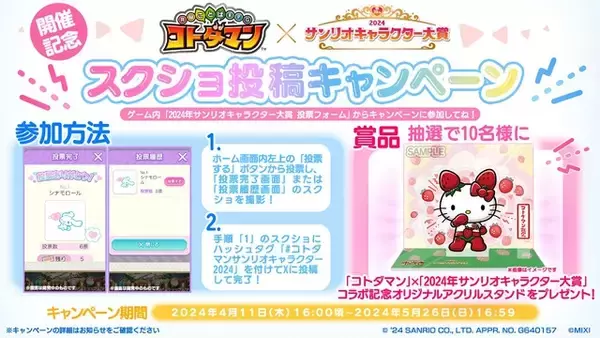 「コトダマン」×「2024 年サンリオキャラクター大賞」開催記念 スクショ投稿キャンペーン(C)'24 SANRIO CO., LTD. APPR. NO. G650007 (C)MIXI