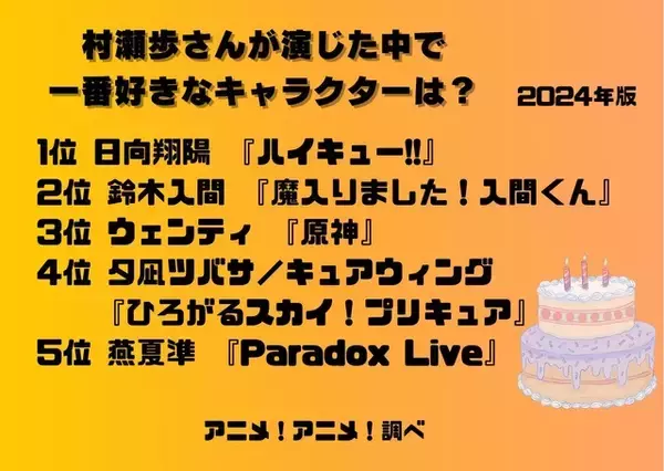 「村瀬歩さんお誕生日記念! 一番好きなキャラは? 「ハイキュー!!」日向翔陽が6年連続トップ! 「原神」ウェンティ、「入間くん」鈴木入間もランクイン<24年版>」の画像