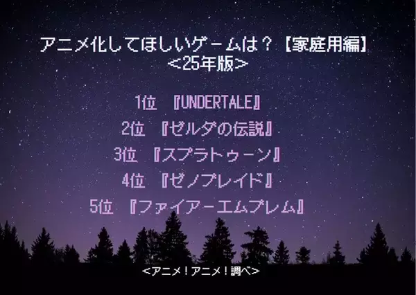「アニメ化してほしいゲームは?【家庭用編】3位「スプラトゥーン」、2位「ゼルダの伝説」、1位「UNDERTALE」<25年版>」の画像