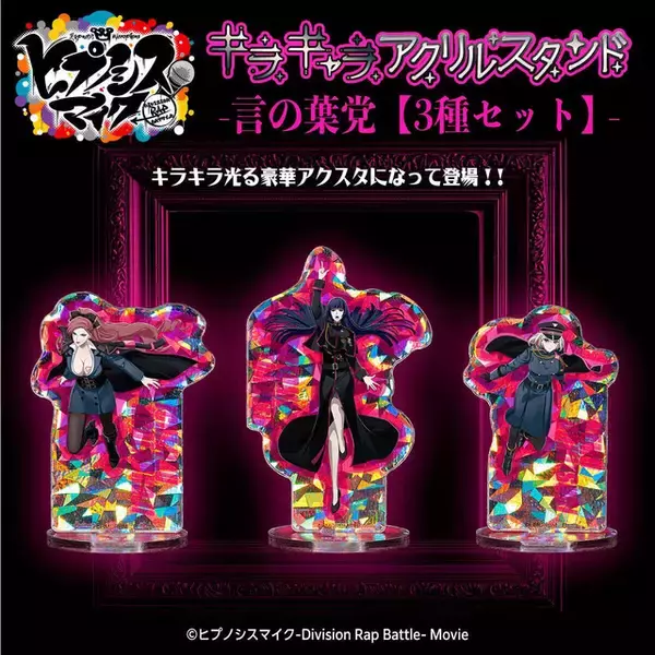 「ヒプノシスマイク キラキャラアクリルスタンド 言の葉党【3種セット】」は、劇中で敵役として登場した言の葉党のメンバー、東方天乙統女、勘解由小路無花果、碧棺合歓の全身姿が楽しめるアイテム。