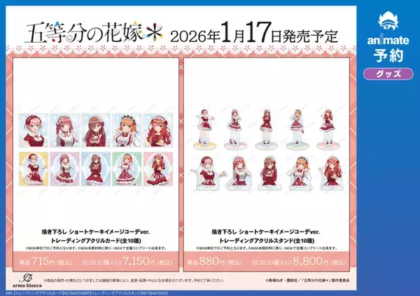 TVスペシャルアニメ『五等分の花嫁*』に登場する中野家の五つ子たちを「ショートケーキコーデ」にコンセプトに描き下ろし、新グッズを展開する「アニメイトフェア」の開催が決定した。2026年1月17日よりア...