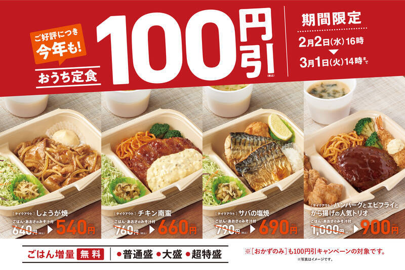 「やよい軒」では、テイクアウトメニュー「おうち定食」4商品を100円引きの特別価格で提供するキャンペーンを2月2日16時より開始します。全国373店舗で実施。