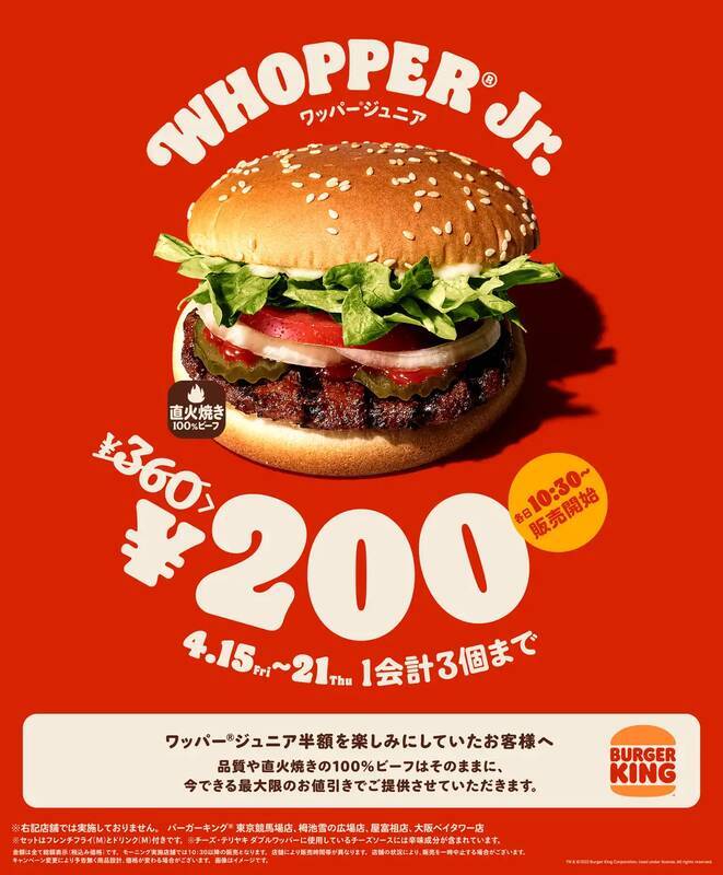 ・内容:「ワッパー ジュニア」を通常価格360円のところ200円で販売(税込)