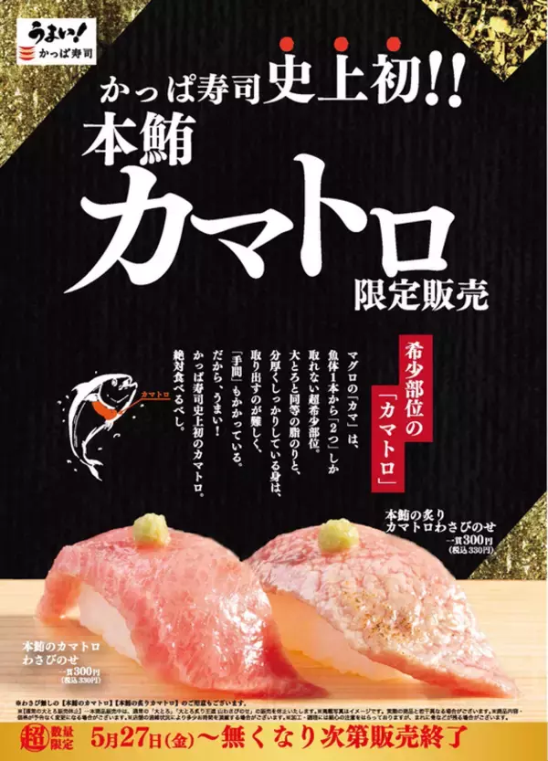 かっぱ寿司は、5月27日より数量限定で「本鮪カマトロ」を販売します。価格は一貫330円。