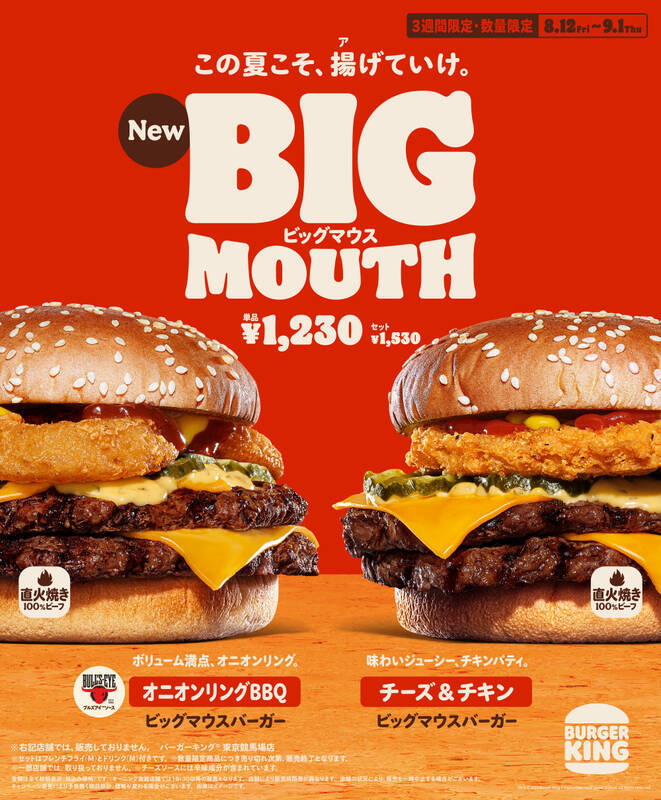 バーガーキングは、直火焼きの100%ビーフパティ2枚と揚げ物をサンドした「オニオンリングBBQ ビッグマウスバーガー」「チーズ&チキン ビッグマウスバーガー」の2種類を8月12日~9月1日の3週間限定・数量限定で新発売します。