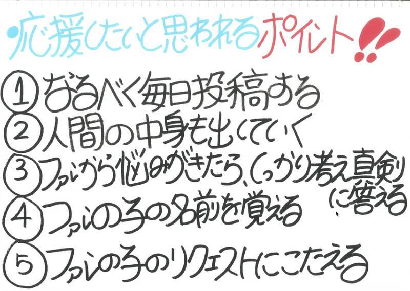 ファンから「応援したい!」と思われるためのポイントとして、なつみかんさん自身の経験として上げたのが下の画像の5つのポイントだ。