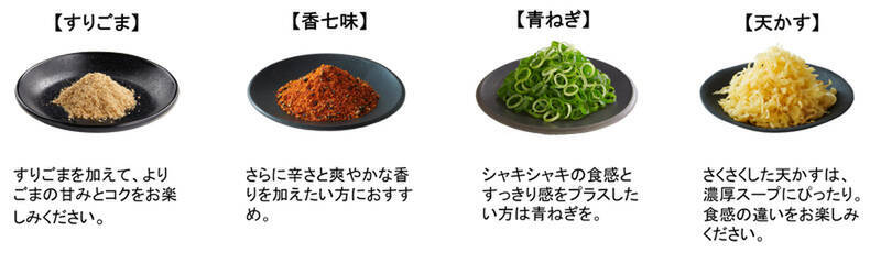 濃厚な担々スープに、辛さと肉感が特徴の肉そぼろ、香味ラー油、彩りのほうれん草、かつお粉の相性が抜群という一杯。今年は「辛さ」が進化し、粗びき唐辛子で辛みをつけた鶏と豚の肉そぼろは、一段と辛さが強調され肉の旨みもしっかり味わえるそう。また、濃厚担々スープに合わせる香味ラー油は、グラム単位で量を調整しています。無料の薬味でアレンジして味わいの変化を楽しむのもおすすめとのこと。