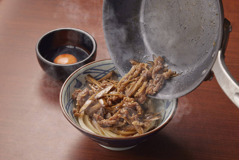 打ち立てのうどんに、目の前で焼き上げる旨みあふれる牛肉、味がよくしみ込んだごぼうのシャキシャキとした食感、さらにまろやかな生玉子が相性抜群という一杯。あつあつの状態ですぐによくかき混ぜると、生玉子へ熱が入り半熟のとろりとした部分もまた違った味わいとして楽しめます。