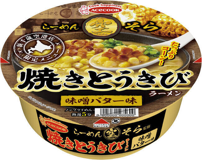 札幌みそラーメンの名店「らーめん空」の新千歳空港の店舗のみで提供している限定メニュー「焼きとうきびラーメン」をカップ麺として再現した商品。