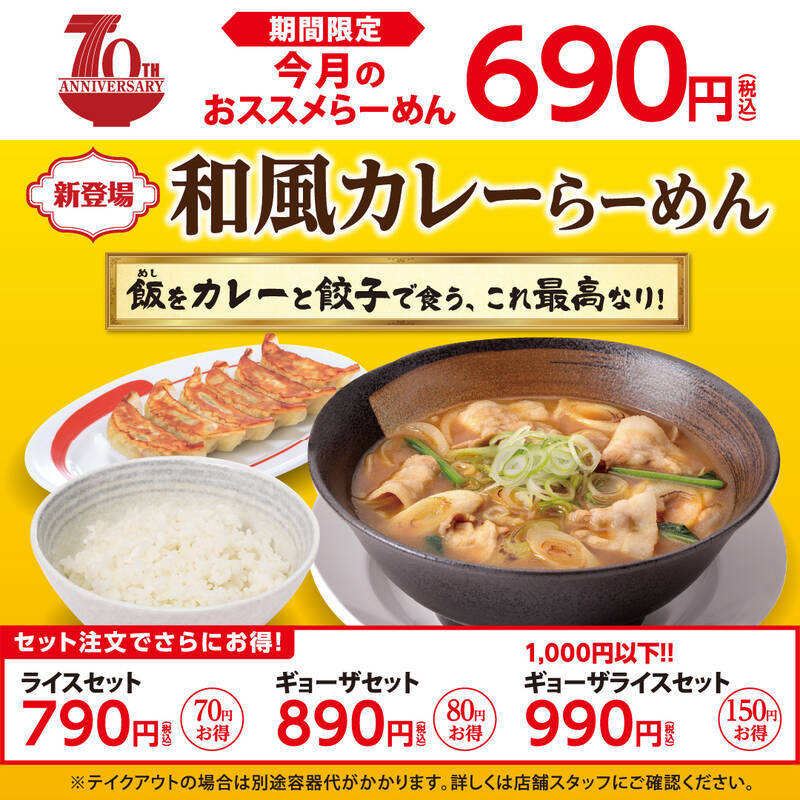 鰹と昆布の和風だしを効かせたとろみのあるカレーらーめん。単品690円で、お得なセットも用意。ライスセット790円、ギョーザセット890円、ギョーザライスセット990円。