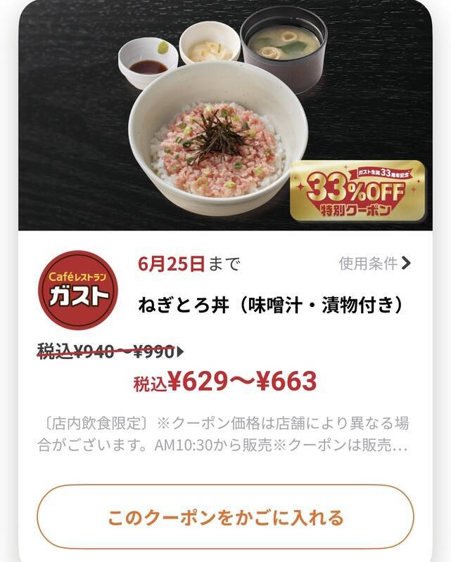 ①「ガスト生誕33周年記念!33%OFF特別クーポン」
