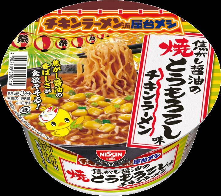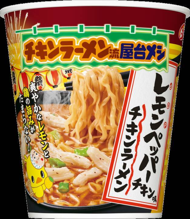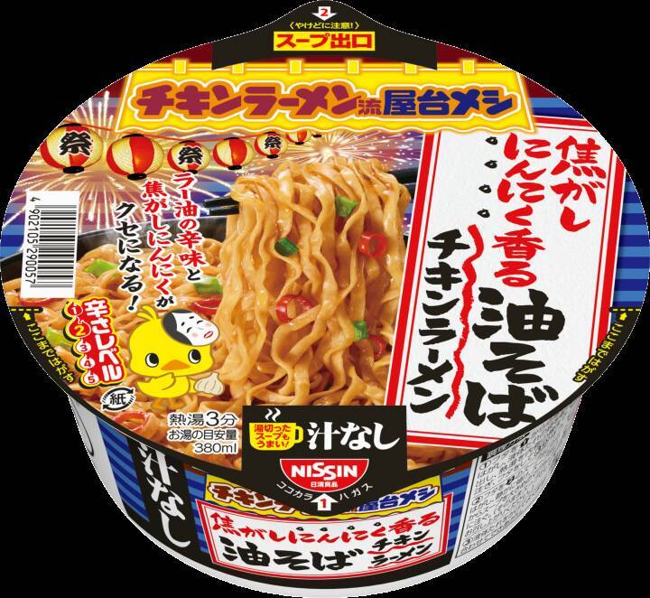 今回登場するのは、いずれも夏祭りの屋台をテーマにしたカップ麺で、「チキンラーメンどんぶり 焦がし醤油の焼とうもろこし味」「チキンラーメン汁なしどんぶり 焦がしにんにく香る油そば」「チキンラーメンビッグカップ レモンペッパーチキン味」の3品です。