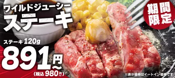 「ステーキキャンペーン」はGWにも好評だったという企画。今回は同チェーンで人気の「ワイルドジューシーステーキ」を120g 980円~の特別価格で提供します。