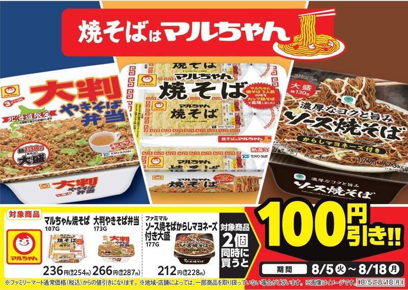 ファミリーマートは、「マルちゃん焼そばの日」にちなみ、対象のカップ焼そばを2個購入すると100円引きになるキャンペーンを8月18日まで実施しています。